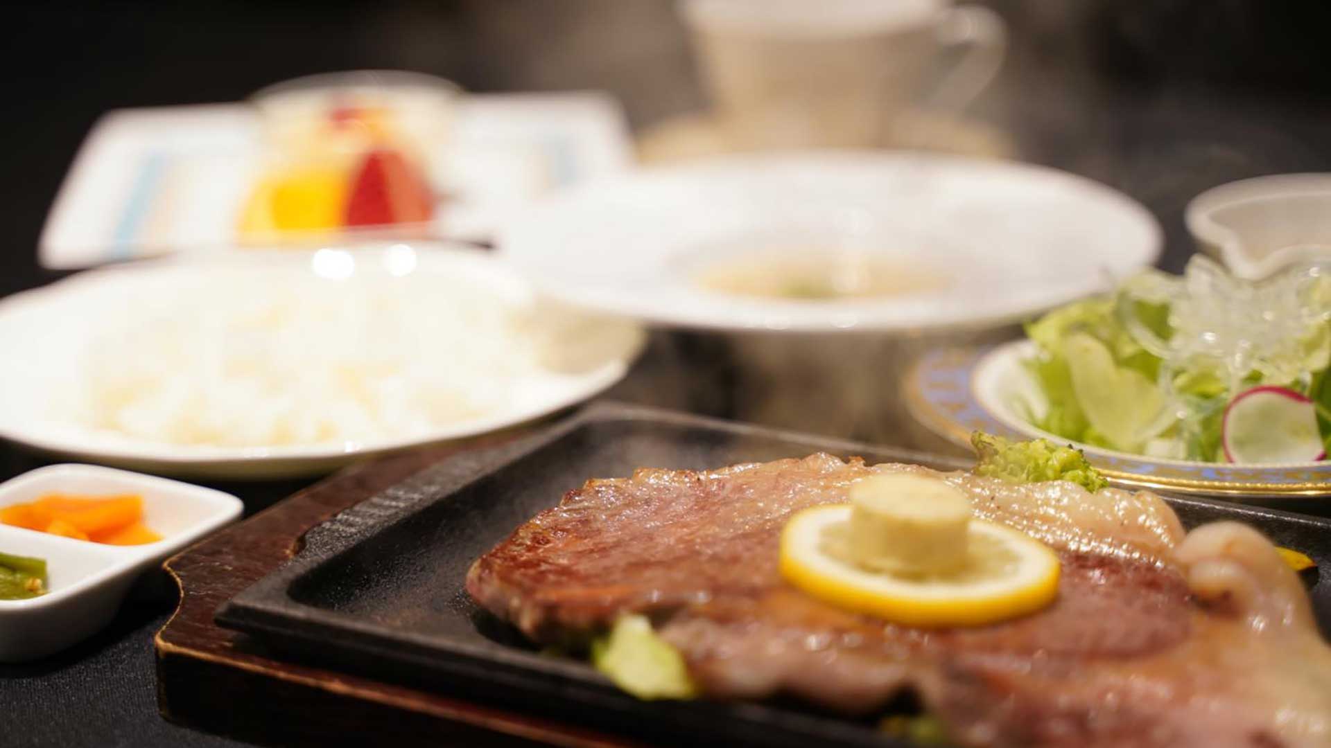 ツアツの鉄板の上に置かれたボリュームのある一枚肉のステーキ。特製のガーリックバターとレモンの香りが食欲を掻き立てます。お昼からガッツリいきたい人におすすめ。